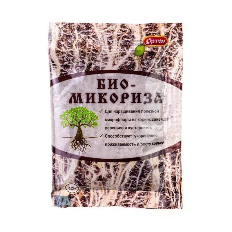 Комплекс полезных микроорганизмов (штаммы грибов рода Гломус), образующих микоризу с корнями растений (симбиоз). Клетки гриба, проникая в растение, снабжают его многими элементами питания (витамины, минералы, фитогормоны и др.) и водой за счет увеличения площади поглощения. •Микориза обладает мощным противомикробным и противогрибковым действием: подавляет корневые и плодовые гнили, семенные инфекции, микроспориоз, фузариоз, фитофтороз, паршу и другие болезни растений. •Способствует улучшению приживаемости растений, усилению корнеобразования, увеличению урожайности плодово-ягодных культур, повышению устойчивости растений к болезням и неблагоприятным погодным условиям, повышению плодородия почвы.